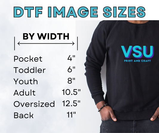 VSU Print & Craft - Direct To Film (DTF) printing uses a process in which images or designs are printed directly onto a transparent film without the need for a separate transfer. This method is commonly used in screen printing, and other forms of traditional printing processes, allowing for precise reproduction of artwork onto various surfaces such as paper and fabric. It offers advantages like accurate color reproduction and sharp detail, making it popular for all crafters. Our printing capabilities are virtually limitless! Making us your one stop shop for DTF transfers!